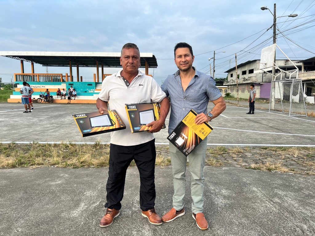 El alcalde entregó implementos que contribuirán al mejor uso de la cancha una vez finalizada la intervención, se hizo entrega de un balón y tres reflectores LED, elementos que fortalecerán tanto la práctica deportiva como la iluminación del espacio en horarios nocturnos.
