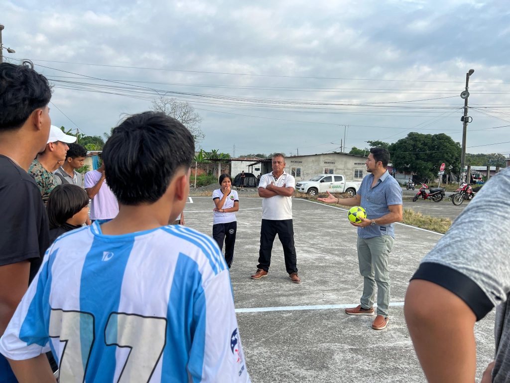Con el objetivo de verificar los avances de la obra, el alcalde del cantón, Dr. Cristian Suárez, realizó una visita técnica al lugar. Durante el recorrido, pudo constatar el progreso de los trabajos que se están ejecutando, así como dialogar con los jóvenes deportistas del sector.